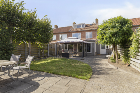De zonnige achtertuin kun je zowel via de dubbele openslaande tuindeuren als via de loopdeur in de achtergevel bereiken.