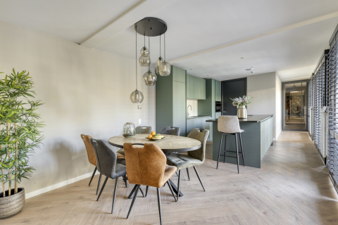 Vanuit de hal loop je door naar de woonkamer en keuken, waar je direct de ruimte en het licht ervaart. De superstrakke en luxe keuken ligt aan de voorzijde en is van alle gemakken voorzien. De L-opstelling is slim ingedeeld met een hoog kastenblok tegenover het kookgedeelte, waarin de combi-oven/magnetron, vriezer en koelkast zijn geïntegreerd. Het kookgedeelte zelf beschikt over een inductiekookplaat met afzuigkap en vier grote – deels dubbele – lades voor veel opbergruimte. Het spoelgedeelte met kraan en vaatwasser bevindt zich aan de korte zijde van de keuken, waar ook een barzit is gecreëerd. Ideaal voor een snelle maaltijd of een drankje met vrienden terwijl je kookt!