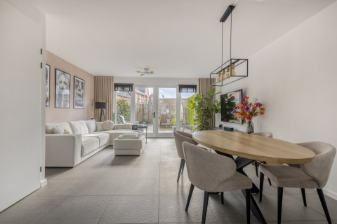 De woonkamer en keuken samen beslaan maar liefst 46,8 m², waardoor je volop ruimte hebt voor een royale zithoek, een grote eettafel en zelfs een speelhoek voor de kinderen. De laminaatvloer met brede plank, strak gestucte wanden en gespoten plafond geven de ruimte een luxe uitstraling.